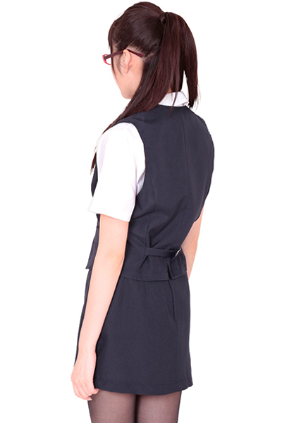 落ち着いた紺色が清楚な秘書の雰囲気を演出!胸元がセクシーな半袖ブラウスとミニスカートに、3つボタンベストのなりきりOLコスプレ3点セットです。