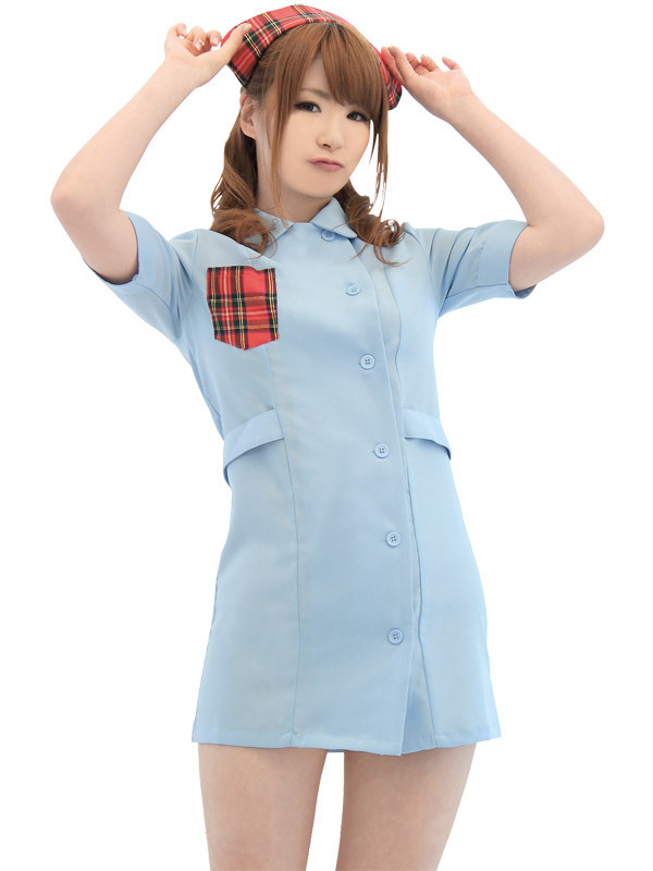 涼しげな水色カラーのナースワンピースに、赤チェックの胸元ポケットを施し、同柄のナースキャップで乙女チックなイメージに!丸襟とボタン仕様がオシャレのアクセントになり、可愛さもグンっとUP!彼もときめくナース風コスチュームです。