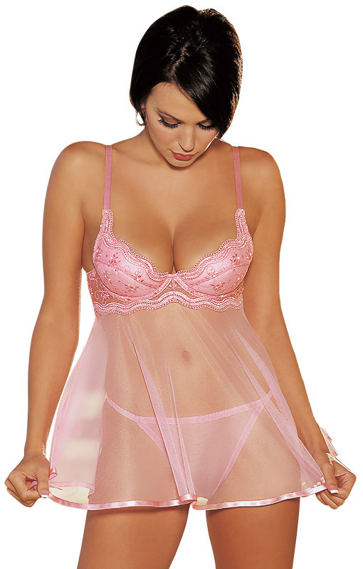 スカラップレースがバストをゴージャスに飾るピンクベビードール&ショーツのセット。