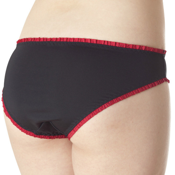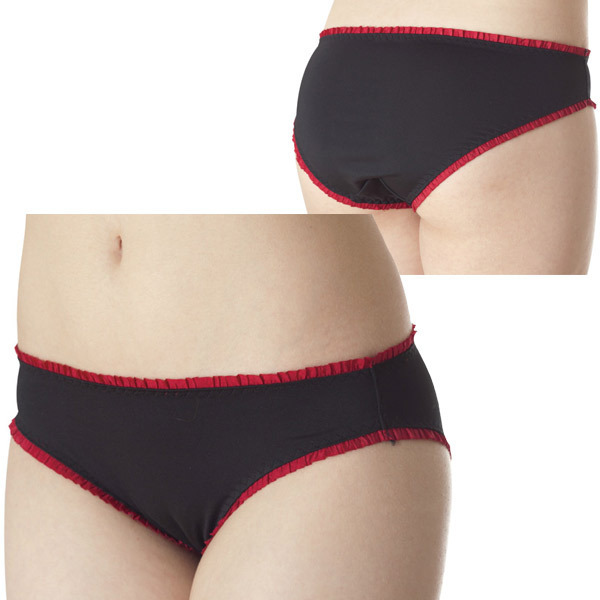 ●デイリーにも使いやすいローライズ●すっきりシンプルなブラックベース●赤ギャザーフリルでパイピング●履きやすいハーフバック。