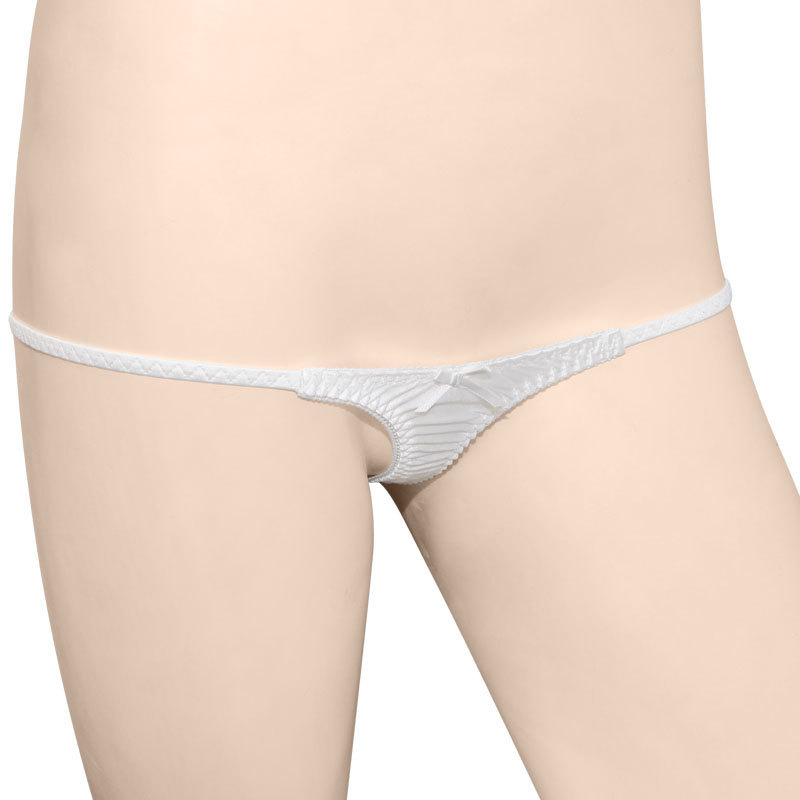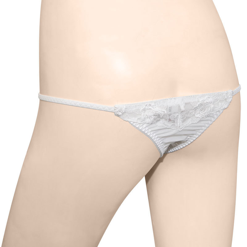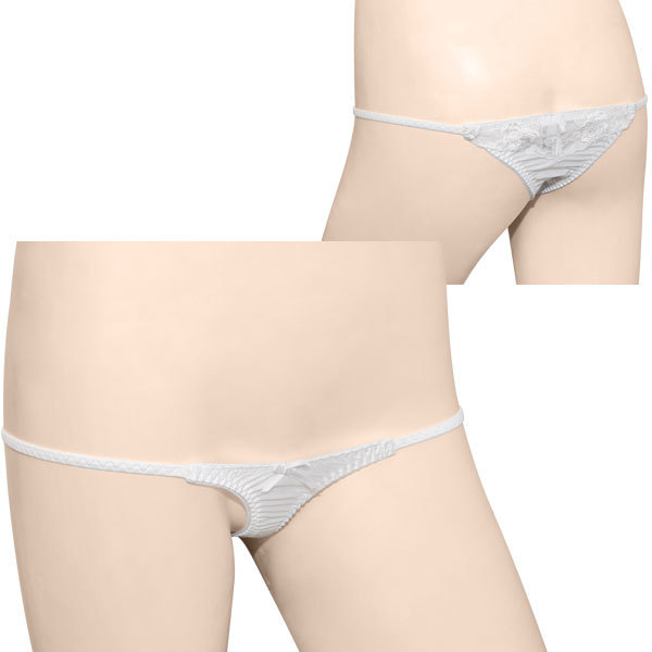 ●清楚なピュアホワイトカラー●両サイドは繊細ストリング●ミニリボン付き極小フロント●ローズ柄の刺繍入りTバック●前後とも生地面積少なめ。