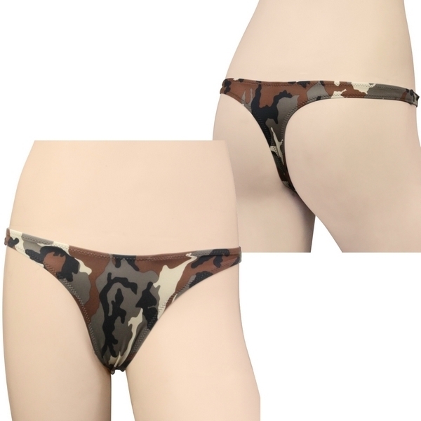 ●ブラウン系のカモフラ柄ショーツ●ストレッチ生地で上下左右に伸縮●ボディにフィットして着心地抜群●セクシーなTバックタイプ●女性用Mサイズ・日本製。