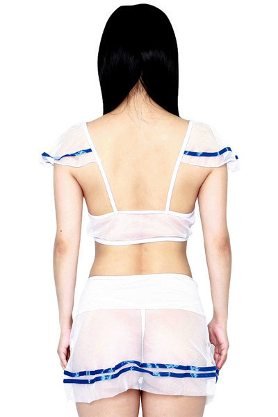 セーラー服とランジェリーが組み合わさったような透け感たっぷりのコスプレ衣装♪シースルー生地に鮮やかな青いラインを2本、胸元をふんわりとした白のリボンで装飾した可愛らしいデザインとなっています♪