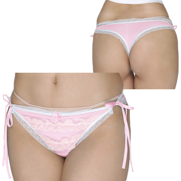 光沢感のあるピンクの生地に白のレースとフリルをあしらった愛らしい日本製Tバック(ピンク)。