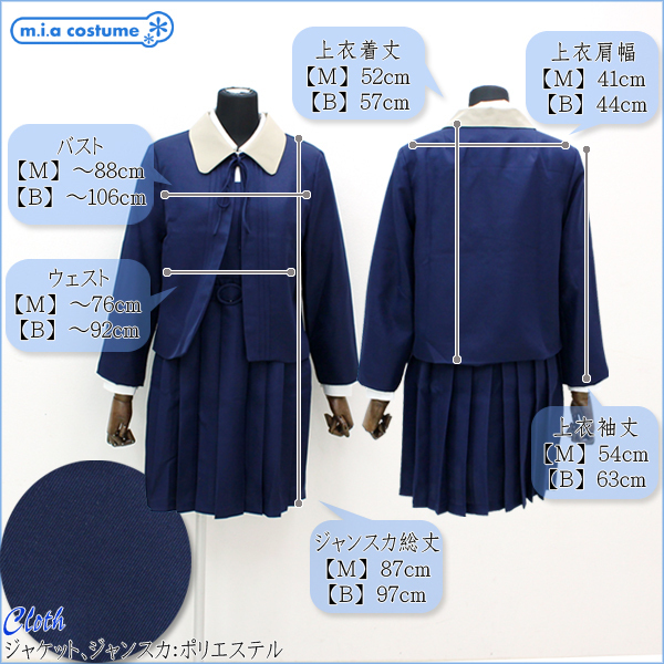 セット内容:ジャケット(襟取り外し可・肩パッド入り)、丸襟ブラウス(前開き・ボタン留め)、ジャンパースカート(バストからウエスト部分に肩ボタンとサイドボタンで着脱可・ベルト取り外し可)、ベルト