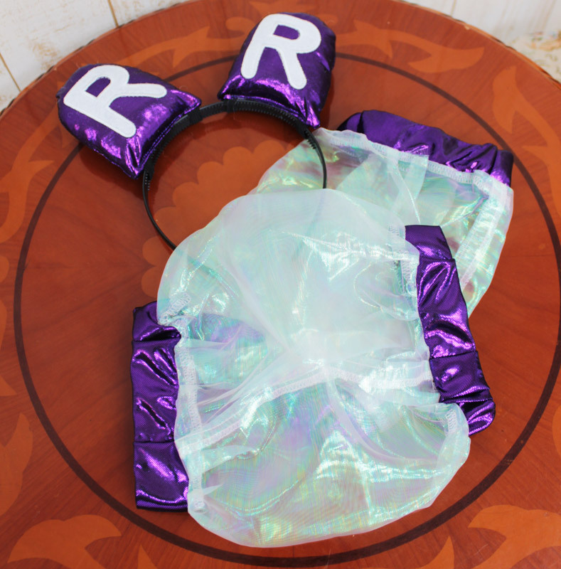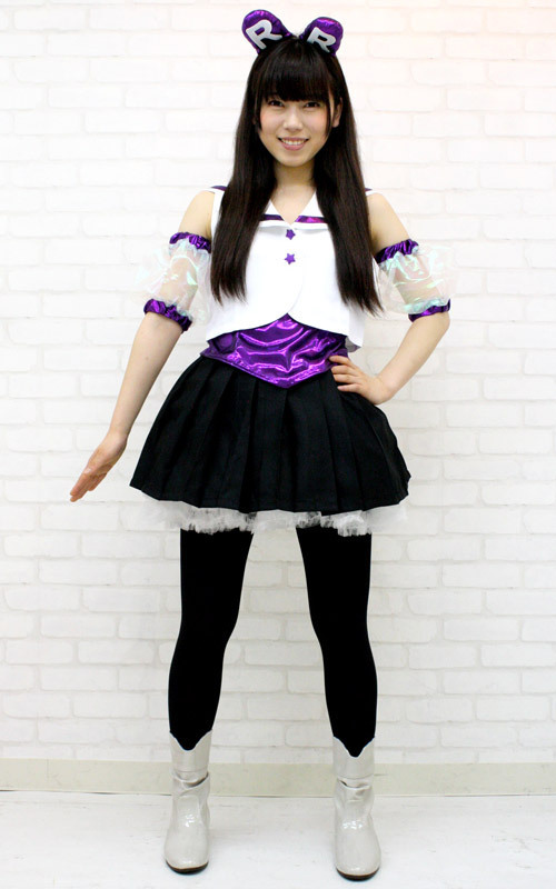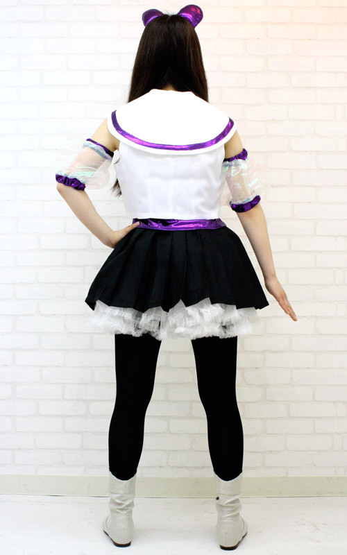 光沢のあるパープルカラーのインナーに、ミニ丈の襟付きベストがキュート!アームカバーやカチューシャ、パニエまで付属したなりきりアイドル衣装です。
