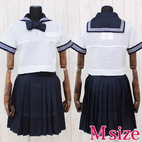 ●爽やかな半袖セーラーブラウス&紺色スカート●セーラー襟&袖に3本の白ライン入り●可愛らしい小ぶりな紺色リボン。