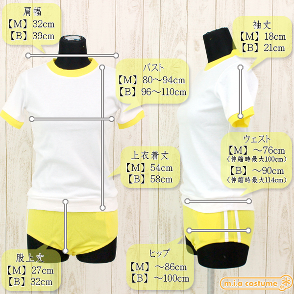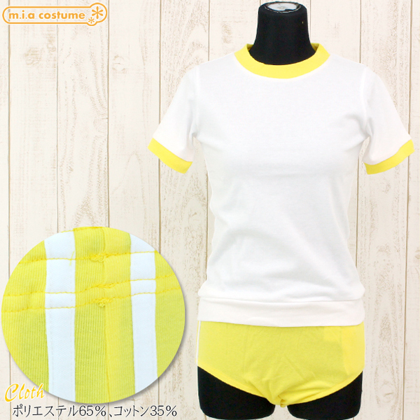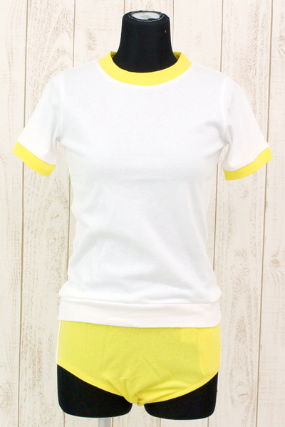 注目度満点の黄色ブルマに白のトップスを組み合わせた可愛い体操服コスプレ♪黄色のブルマのサイドには2本の白ラインを施し本格派デザインに仕上げています。