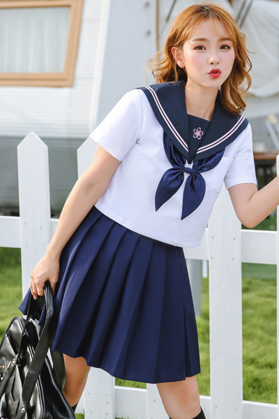桜モチーフの校章が本格的♪紺×白のミニ丈半袖セーラー服コスプレ。